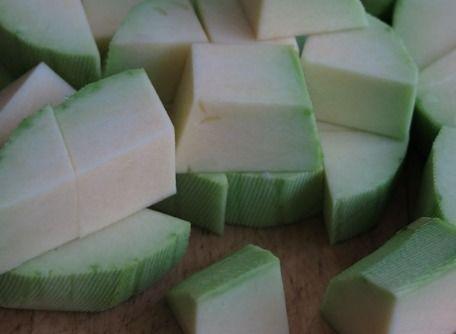 将小砍瓜洗净切片,用开水焯一下去除草酸,捞出备用。锅中放油,加入蒜末爆香,再放入小砍瓜翻炒至断生,加入适量盐、鸡精调味即可。